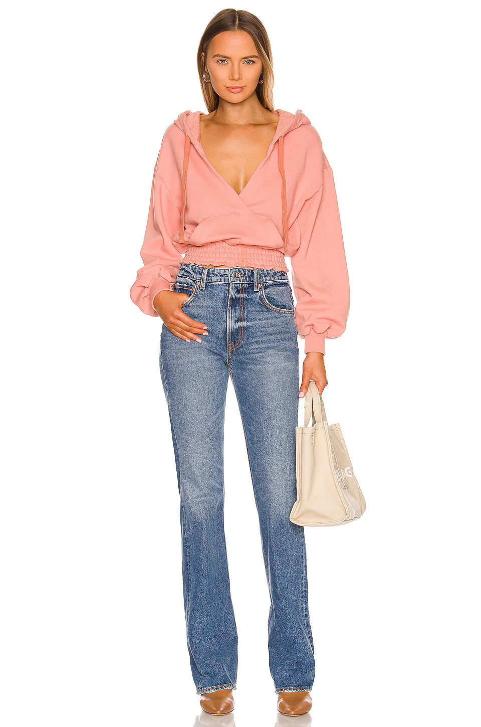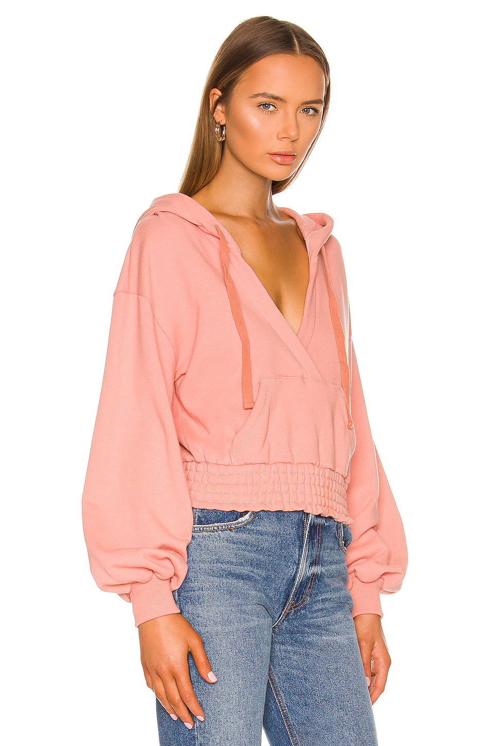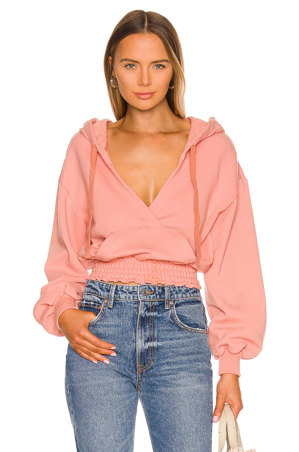 - Drawstring hood and V-neckline
